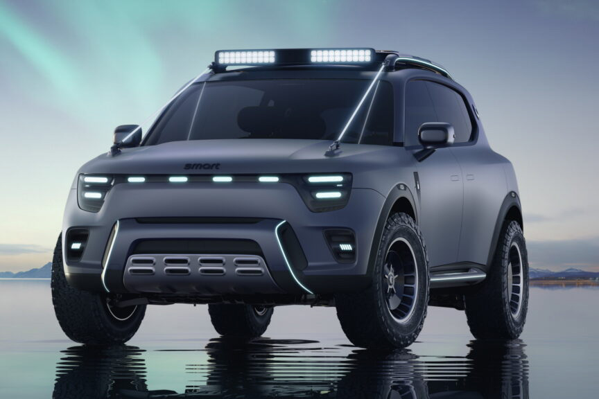 O novo Smart traz carroceria bem parruda, com capô bem marcado e reto, frente agressiva e elementos aventureiros, como pneus off-road, rack de teto e até uma corda que liga o teto ao capô. Alguns pontos extras serão removidos no modelo de produção.