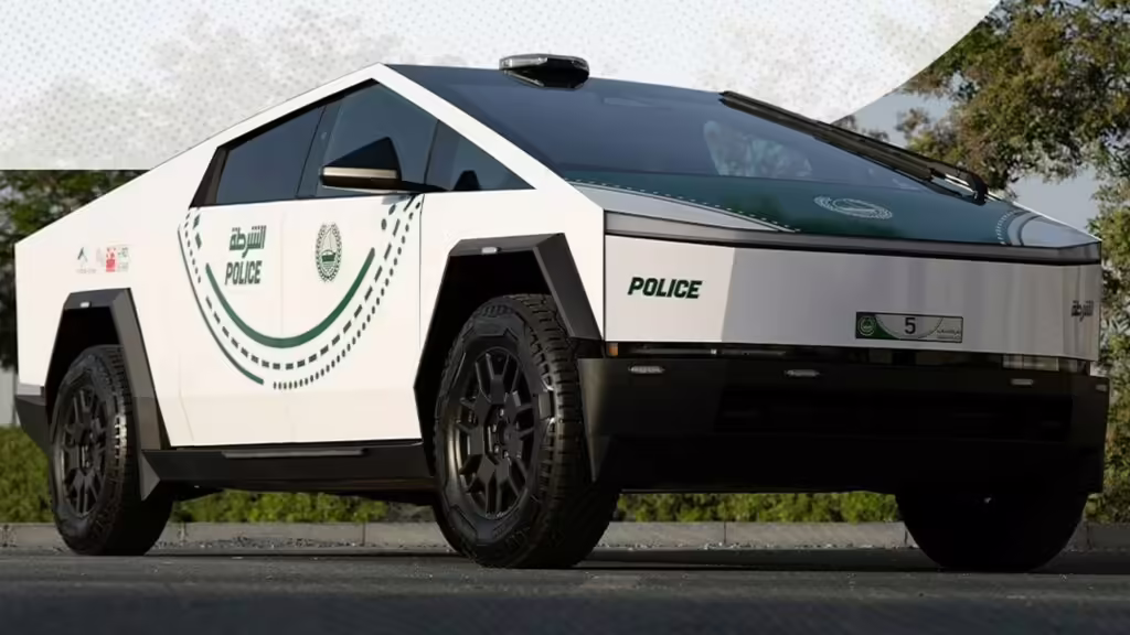 A cidade de Dubai, nos Emirados Árabes Unidos, é famosa por suas construções grandiosas, o luxo e as viaturas de polícia peculiares. A última aquisição a integrar a frota é a caminhonete Tesla Cybertruck, que recebeu pintura branca na carroceria, grafismos em verde, highlights no teto e luzes auxiliares no para-choque frontal.