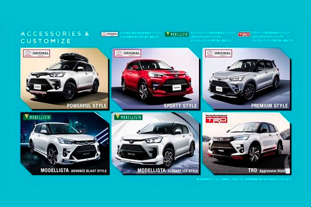 O Toyota Raize utiliza a mesma carroceria do Daihatsu Rocky, mas conta com um visual nitidamente inspirado no SUV maior da marca, o RAV4. Além do desenho da carroceria, pelas imagens vazadas é possível perceber que o modelo compartilha também os mesmos faróis e desenho das lanternas.