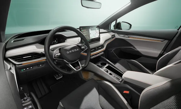 Mesmo sendo uma marca de entrada, o interior do Skoda Elroq é bem feito. Ele conta com uma larga faixa de couro, painel de instrumentos digital pequeno e central multimídia flutuante, além de console central alto. É uma cabine que só não é idêntica a um BYD porque a central não roda de um lado para o outro e há peças de Volkswagen.