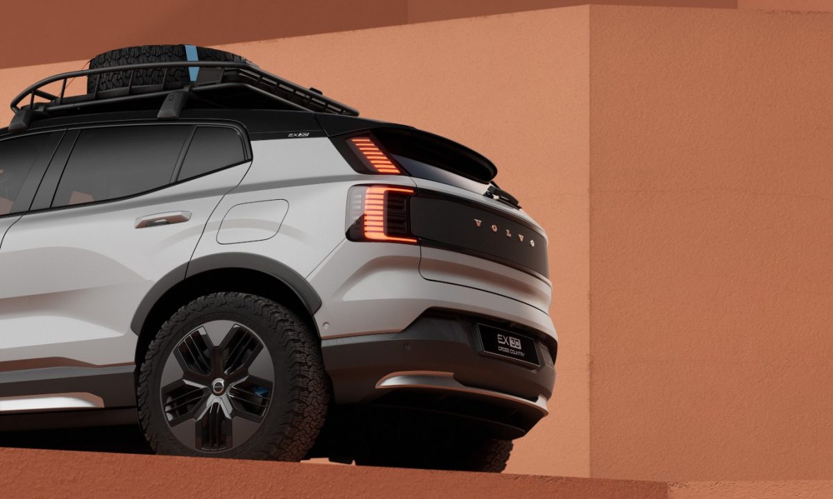 O EX30 Cross Country se diferencia visualmente por ter uma proposta mais aventureira. A carroceria traz maior altura em relação ao solo, molduras plásticas nas caixas de roda, para-choques redesenhados e detalhes exclusivos em cinza fosco. A grade frontal também muda, com linhas mais agressivas e inserções escurecidas. No teto, há barras longitudinais que dão o apelo mais off-road.